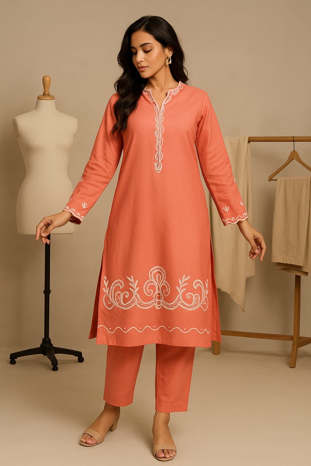 "Peachy" has been styled in the image for photography and illustrative purposes. The subtle embroidery and refined cutwork add a graceful charm to this breathable summer look.
